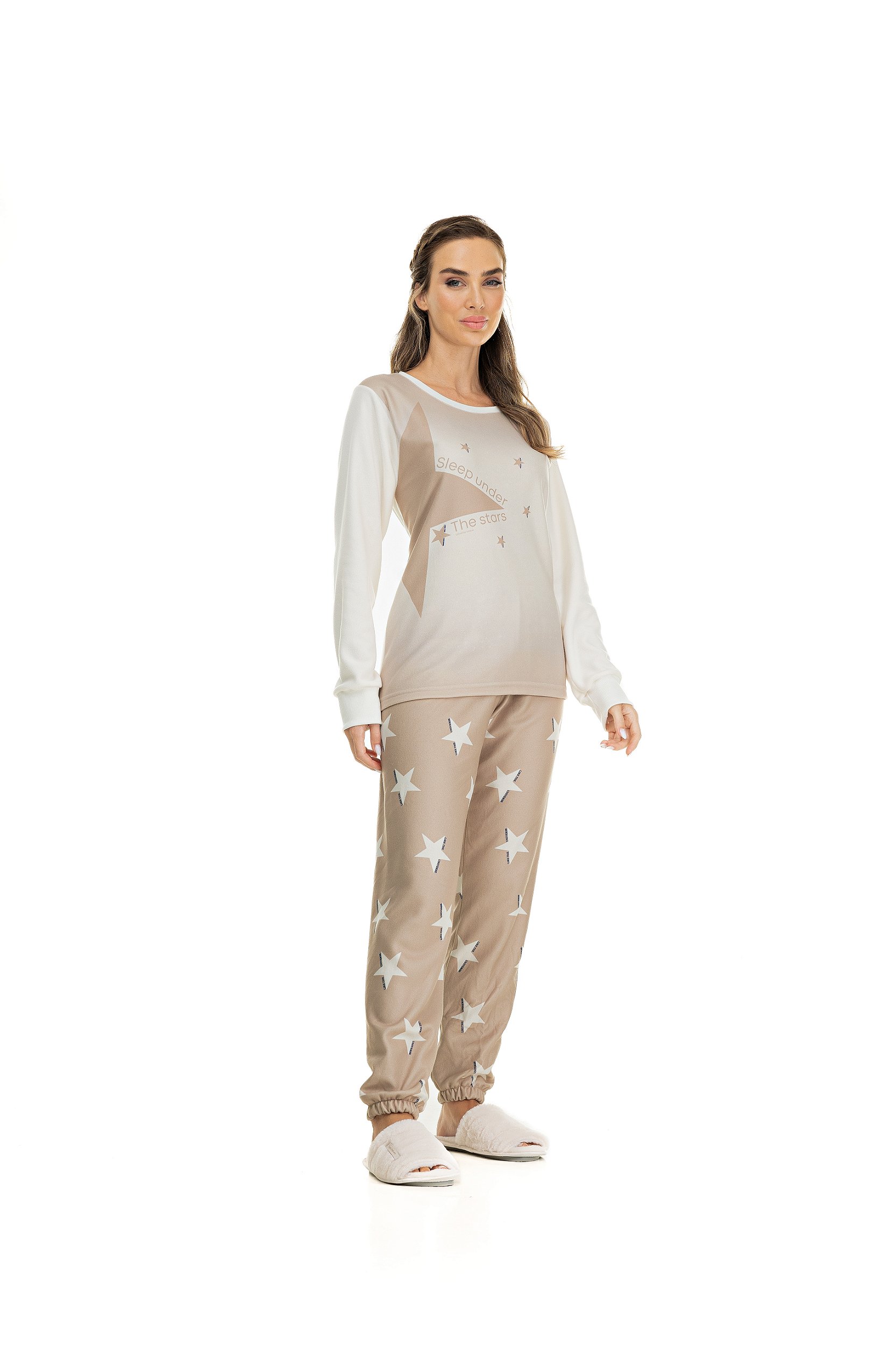 Pijama longo estrela bege new soft, composto por 100% poliéster.